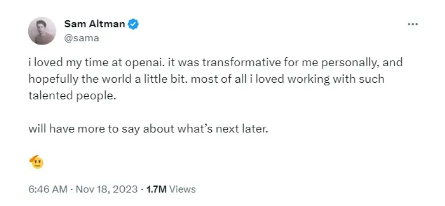 지난 11월 17일, OpenAI 이사회는 샘 알트먼이 CEO 및 이사회 자리에서 물러날 것이라고 발표했다. 정식 후임자를 찾기 전에 회사의 최고 기술책임자인 미라 무라티가 임시 CEO로서 역할을 수행하게 된다.